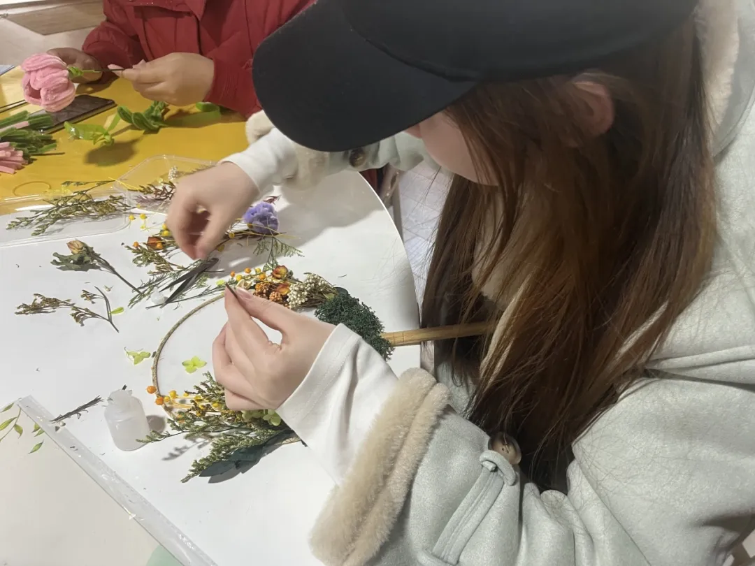 在“指尖留韵—制作干花团扇和干花相框”环节中,同学们运用丰富的色彩搭配,用灵巧的双手将干花修剪,整枝、组合,用花的温柔点缀扇的风姿,定格相框的风韵,制作出一个个精美的干花团扇。