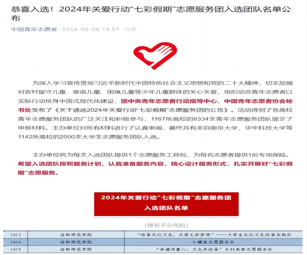 此次遴选共有来自全国1000多所高校的6334支青年志愿服务团队申报。经评审,2000支团队入选2024年“七彩假期”志愿服务示范团队。据了解,我校三支团队将于暑假社会实践期间围绕农村留守儿童、寄宿儿童、困境儿童等少年儿童群体根据需要开展亲情陪伴、课业辅导、心理疏导、情感慰藉、组织户外活动等关心关爱活动。校团委将对入选团队开展“跟踪式”指导和服务,确保志愿服务活动高质量推进,不断锤炼洛师学子高尚品格,提升服务社会本领,在实现中华民族伟大复兴的中国梦的火热实践中绽放青春华彩。