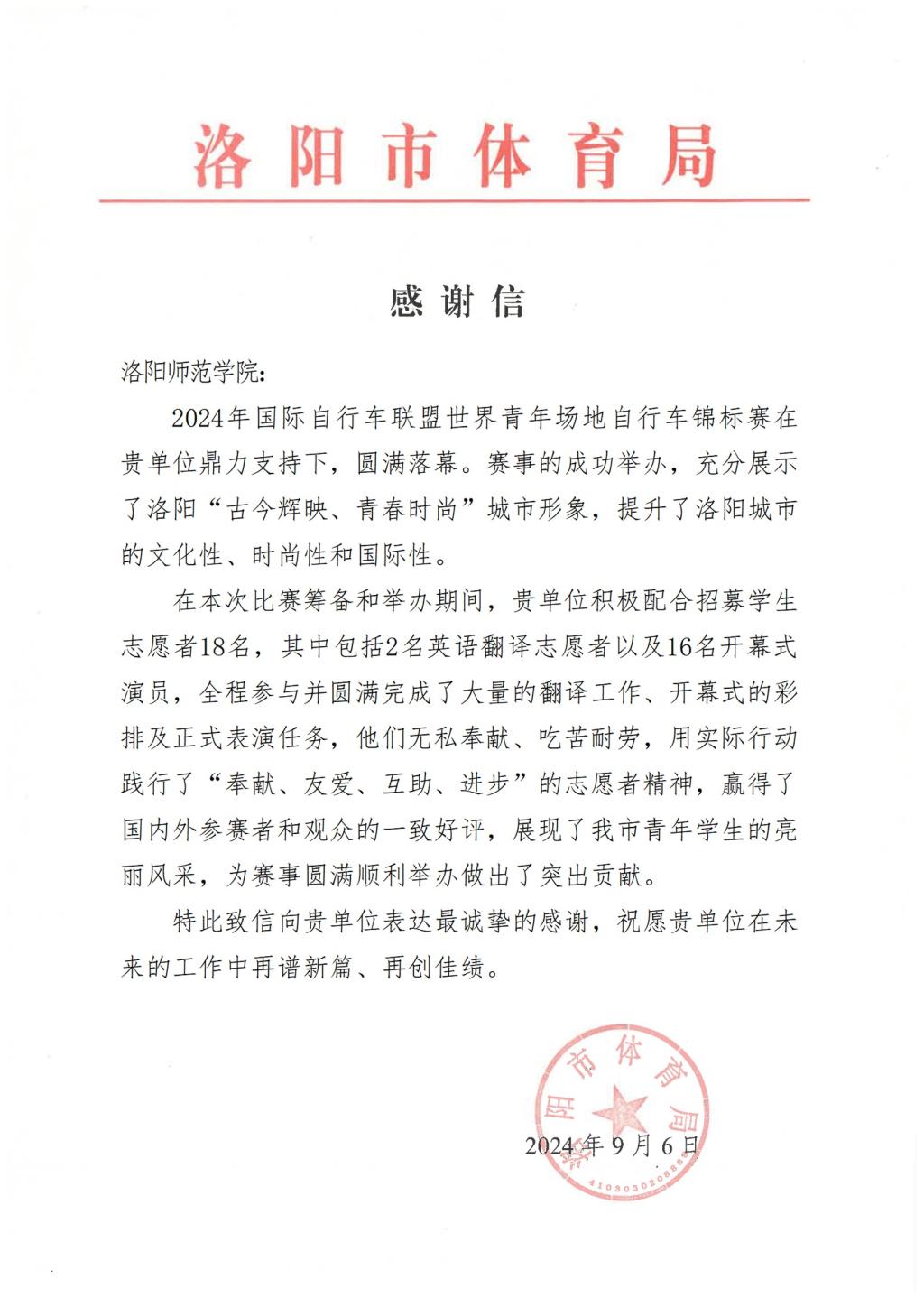 近日,洛阳市体育局向我校发来感谢信,对我校青年志愿者在2024年国际自行车联盟世界青年场地自行车锦标赛志愿服务中的表现给予高度赞扬并表示感谢。