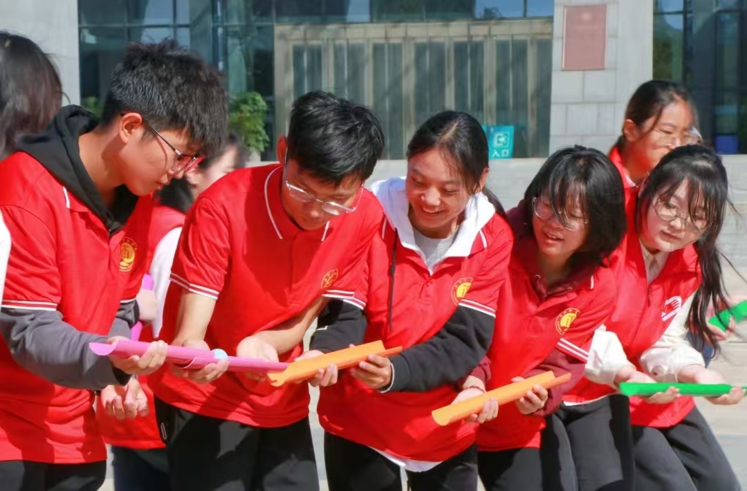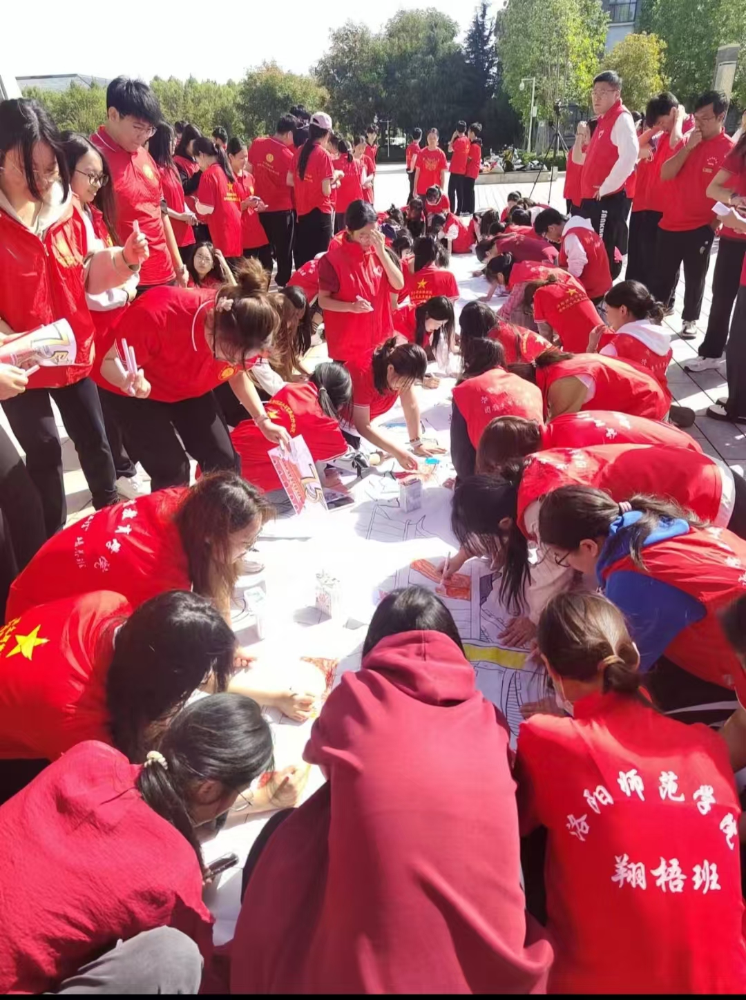 活动共分为三个部分:青春重走复兴路,从“微长征”“团结抗‘站’”“决战连连看”“团结奋进环”到“跃动青春”,五个红色主题活动让大家在参与过程中感悟革命精神,传承红色基因,增强文化自信;青春绘就强国梦,同学们手执画笔,共同绘制了一幅庆祝新中国七十五岁生日的十米长卷,丰收的粮仓、腾飞的火箭、夺金的健儿等内容展现了新时代伟大祖国取得的辉煌成就;在青春共筑爱国心活动中,同学们用“一颗颗红心”围绕“国”字,寓意“国在心中,心中有国”。