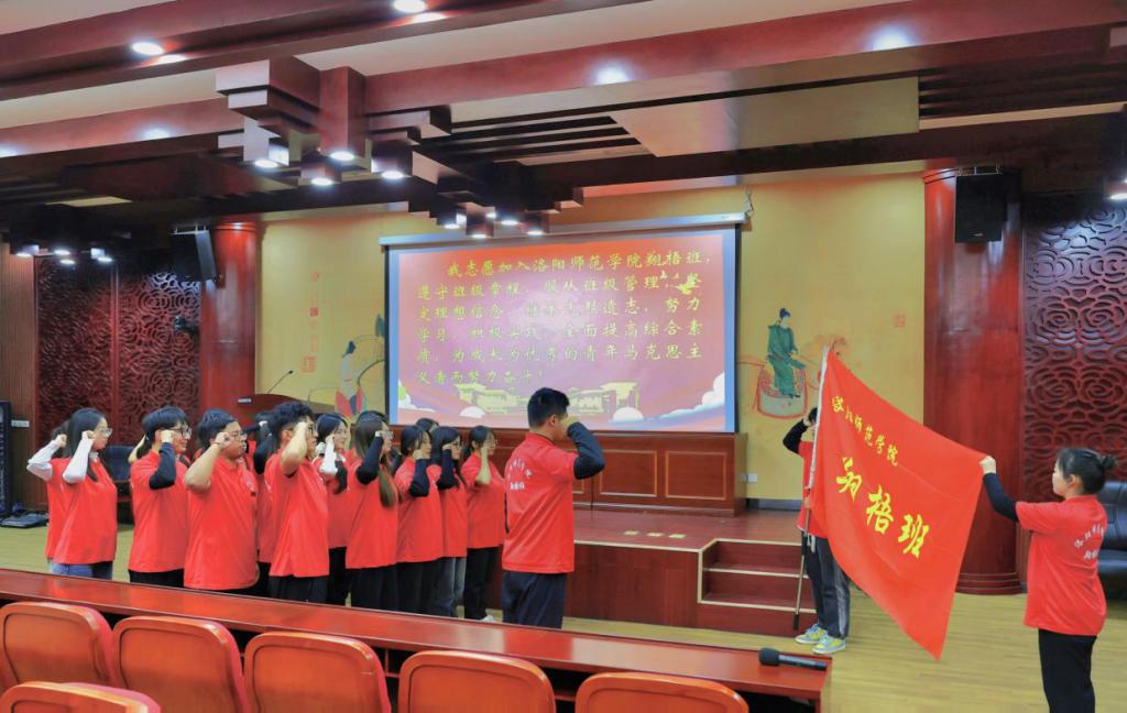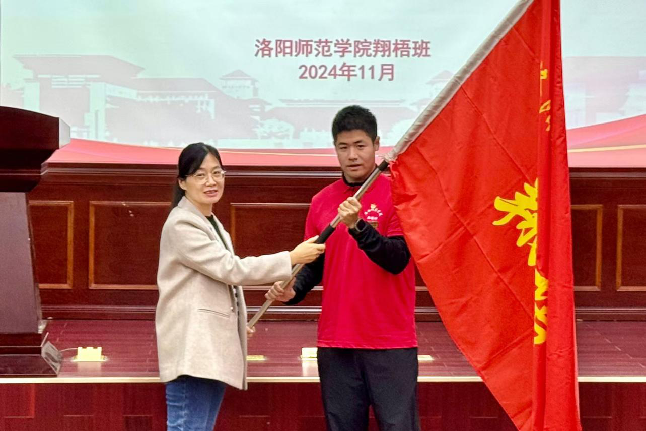 翔梧班第十八期班长马乐从校团委书记高莹手中郑重接过班旗,全体学员面对班旗进行宣誓,表达了牢记使命、不负嘱托、奋发成才的决心。