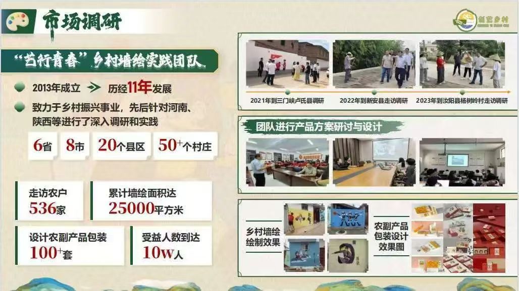该项目团队始于2013年成立的“艺行青春”乡村墙绘实践团队,历经11年发展。先后到河南、陕西等6省,8市,20个县区,50多个村庄,536家农户进行了深入调研、分析和实践,项目累计受益群众10万余人。近年来,项目开发了红色教育、传统文化、普法宣传、国潮动漫、网红打卡、美丽乡村等6大墙绘主题,累积墙绘面积25000平方米,带动了当地文旅产业和经济发展。截至目前,项目共申请专利1项,软著13项,作品著作权5项。项目积极响应国家和美乡村政策,带动乡村经济发展,提高农民生活水平,扩大乡村产业影响力,具有巨大的社会价值。