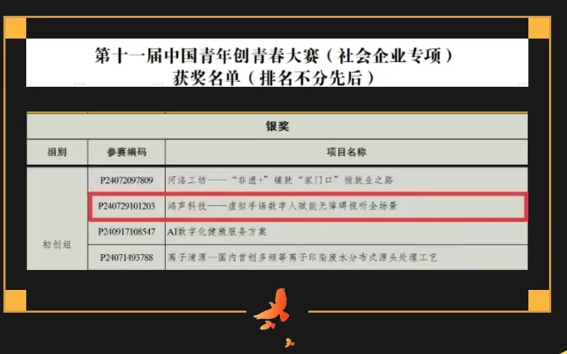 近日,由共青团中央、商务部、国家卫生健康委员会、国家税务总局等部门共同主办的第十一届中国青年创青春大赛获奖名单公布,我校项目《鸿声科技--虚拟手语数字人赋能无障碍视听全场景》荣获“社会企业专项”初创组银奖,取得我校在该项赛事的新突破。