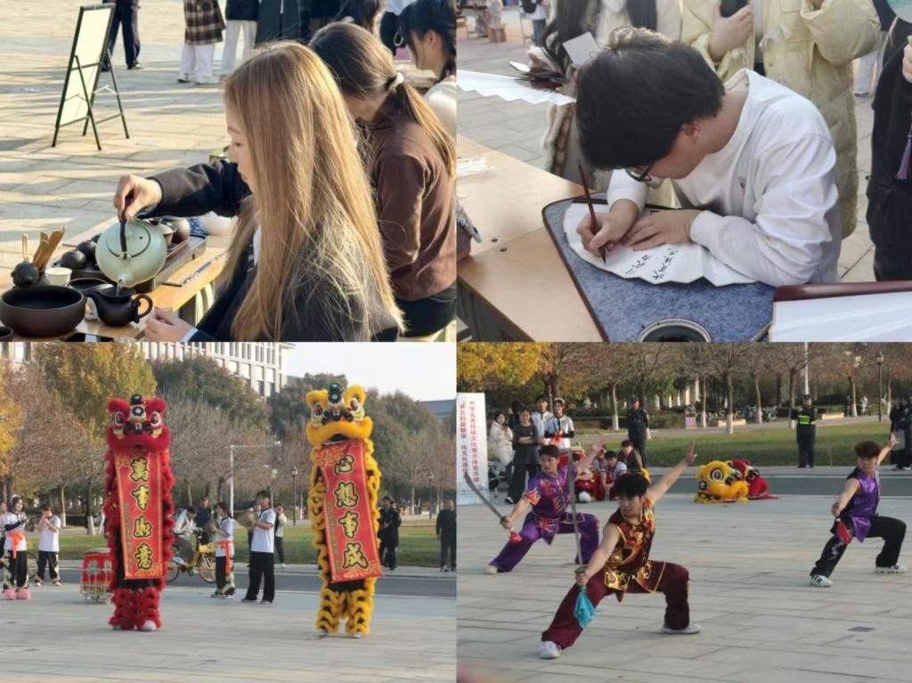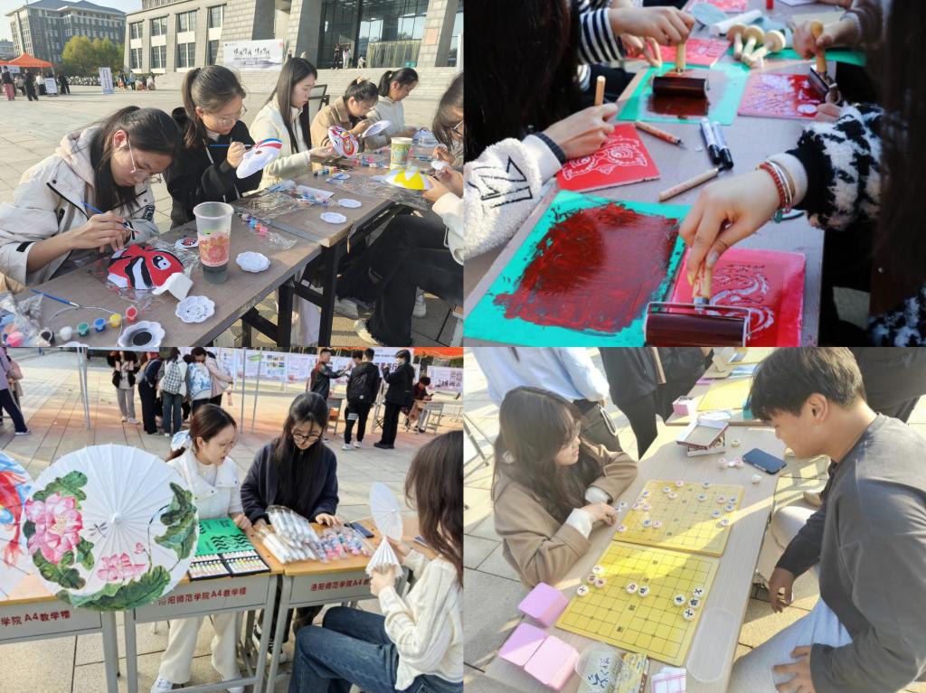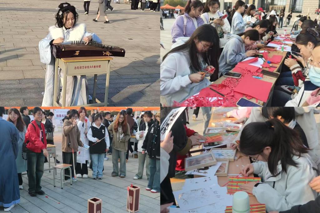 活动现场,古韵与新姿相互交融,处处散发着传统文化的独特魅力。校学生会组织的“彩绘脸谱,传承国粹”非遗脸谱制作体验活动点燃同学们的热情,看图调色绘制脸谱,一笔一画中表达对传统文化的热爱;国学班开展的“传承非遗,拓印美好”非遗拓印体验,教授同学们用宣纸和墨汁印制文字、图案,详细讲解对留存和传承物质文明的重要意义;豫见非遗社团开展“千年匠心绘纸伞,非遗传承映古今”油纸伞创作,通过传统文化知识答题,吸引同学们参与油纸伞DIY创作;奕轩棋社开展的“‘棋’乐无穷,智慧之‘弈’”棋类体验活动,通过棋类知识问答、棋局挑战、棋艺切磋等方式让同学们深入体验棋类文化的魅力;问礼茶社开展的“品茶韵幽香,享诗意人生”茶文化体验活动,茶的飘香吸引了众多同学驻足品尝、观看茶艺展演;翰苑书法社的“翰墨传承,书香沁心”书法体验活动绽放异彩,同学们手持毛笔、蘸墨挥毫,感受着书法艺术熏陶,沉浸于书法创作的乐趣;“传承国风,悦享运动”武术与蹴鞠体验活动将现场气氛推向高潮,表演者身着华丽的服饰,带来精彩的舞狮和武术表演,吸引大家纷纷拍照、拍手称赞。