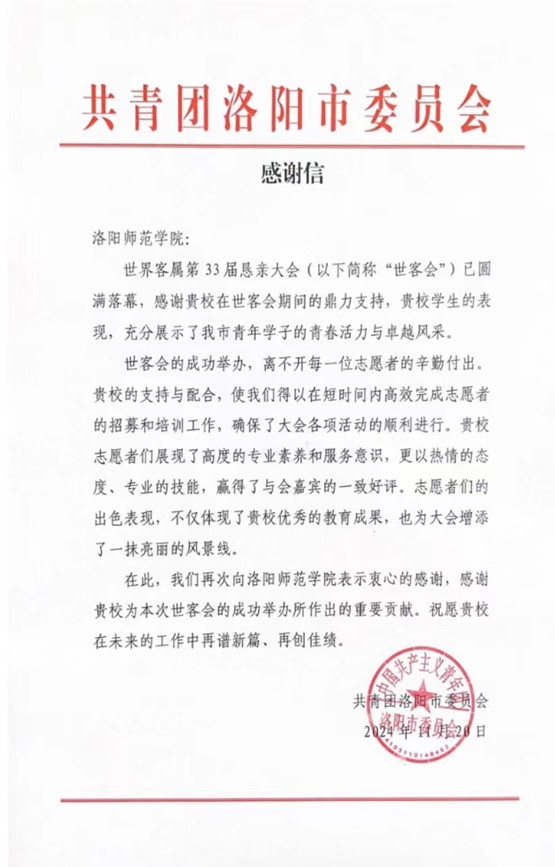 近日,共青团洛阳市委员会向我校发来感谢信,对我校青年志愿者在世界客属第33届恳亲大会中的表现给予高度赞扬并表示感谢。