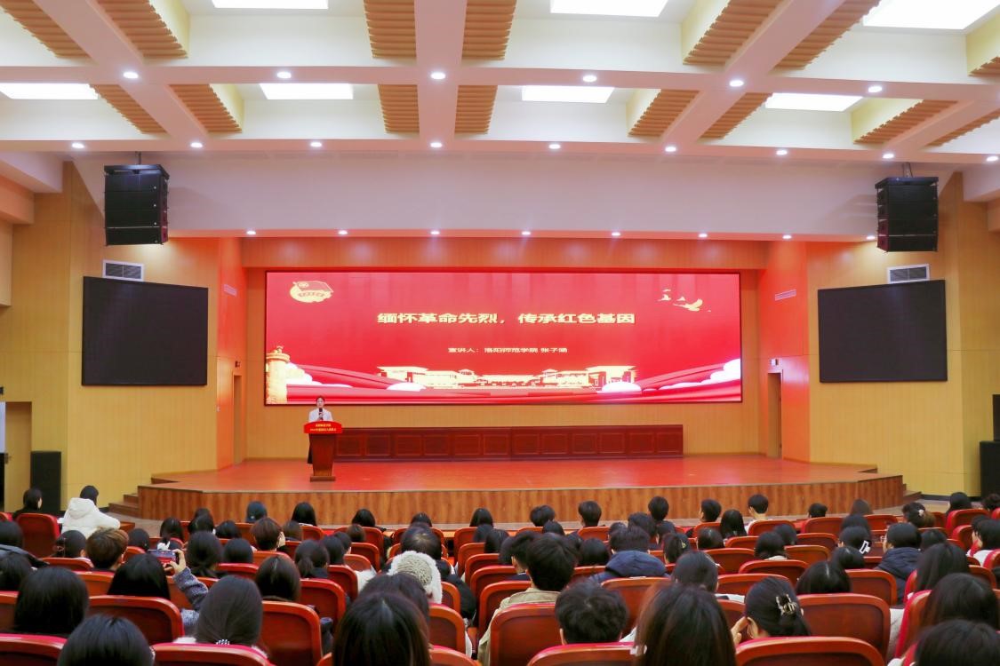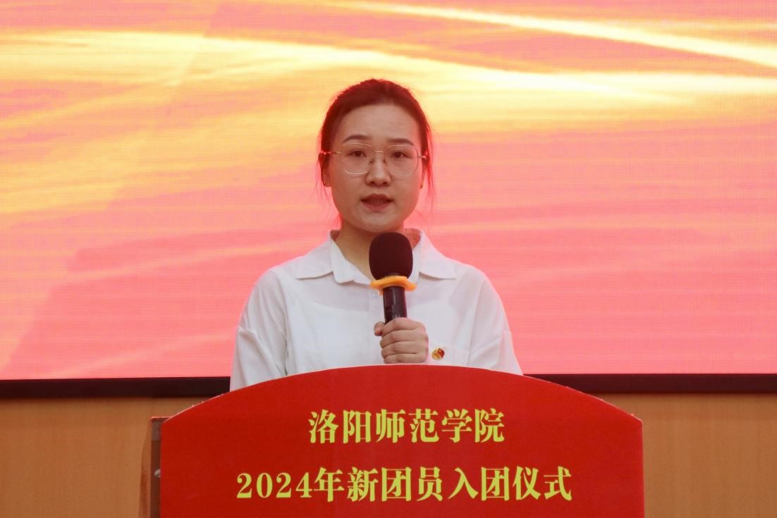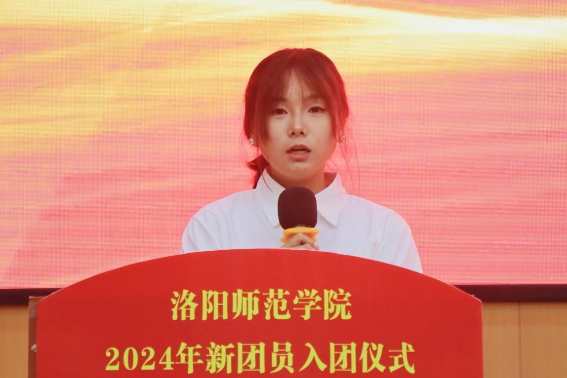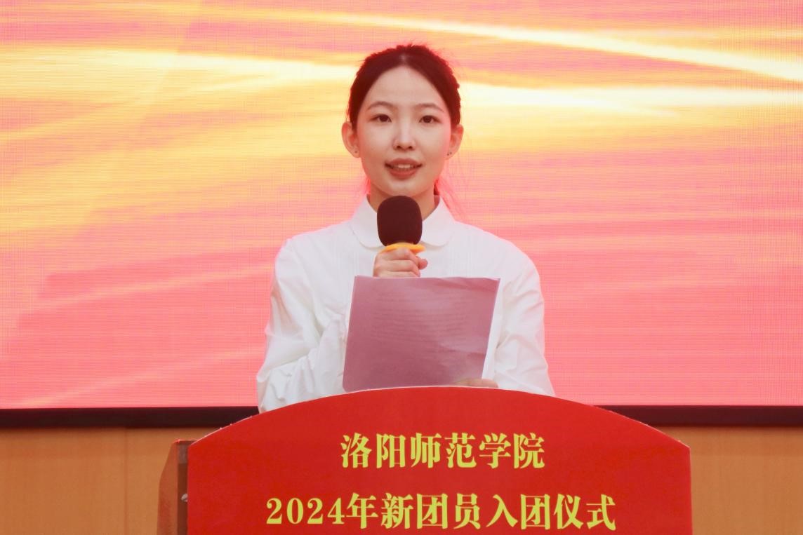 入团介绍人代表曾莹莹宣读《团章》中有关团员的义务和权利的条款。曹昕冉代表新团员发言,她表示,加入共青团不仅仅是一种荣誉,更是一份责任和使命,要时刻保持团员的先进性和积极性,不断学习、不断努力、不断提高。优秀团员代表赵春燕号召新团员们要坚守团员身份的荣誉感和自豪感,时时刻刻做表率,勇于探索,勇于创新,承担时代赋予我们的青春使命。青年讲师团成员张子涵讲述微团课《缅怀革命先烈,传承红色基因》。她通过洛阳师范学院英雄校友李翔梧的英勇事迹,引导团员青年们坚定理想信念,用信仰淬炼青春底色,用奋斗书写华彩人生。