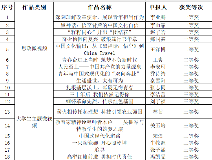 近日,河南省社科联、共青团河南省委、河南省高校思想政治理论课教学指导委员会联合发布《关于公布2024年度河南省大思政微课(微视频)征集活动评选结果的通知》(豫社科联字〔2024〕19号),校团委申报的20项作品在此次活动中共斩获18项奖项,其中思政微视频一等奖4项、二等奖3项、三等奖2项,大学生主题微视频二等奖1项、三等奖8项。