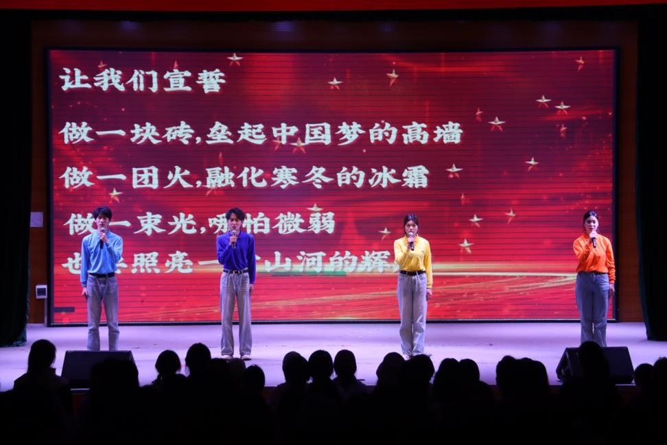 “跨越百年的青春接力”主题思政课分为《青春·理想》《青春·担当》《青春·奋斗》三个篇章,回望百年征程的波澜壮阔,感受代代青年与国家同频、与时代共振的炽热情怀和实干担当。在《青春·理想》篇章,情景讲述、短剧、红色家书朗诵等表现形式,让现场观众聆听百余年前青年的呐喊,深刻感悟革命先辈的崇高理想和坚定的共产主义信念;在《青春·担当》篇章,以英雄校友李翔梧烈士事迹为经,以翔梧班育人实践为纬,编织出一幅展现翔梧青年传承红色基因、赓续红色血脉,勇挑时代重任的青春画卷;在《青春·奋斗》篇章,四名青年榜样分享了“创新”“专注”“拼搏”“志愿”四个青春关键词,展现我校青年学子不负韶华、昂扬奋进的青春姿态,发出新时代洛师青年再创新成就的最强音。在全场合唱《光荣啊,中国共青团》的歌声中,“跨越百年的青春接力”主题思政课圆满结束。