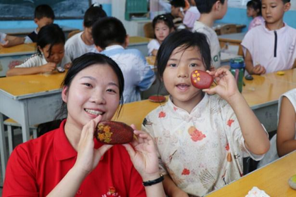 图为实践队队员与孩子们展示课堂作品