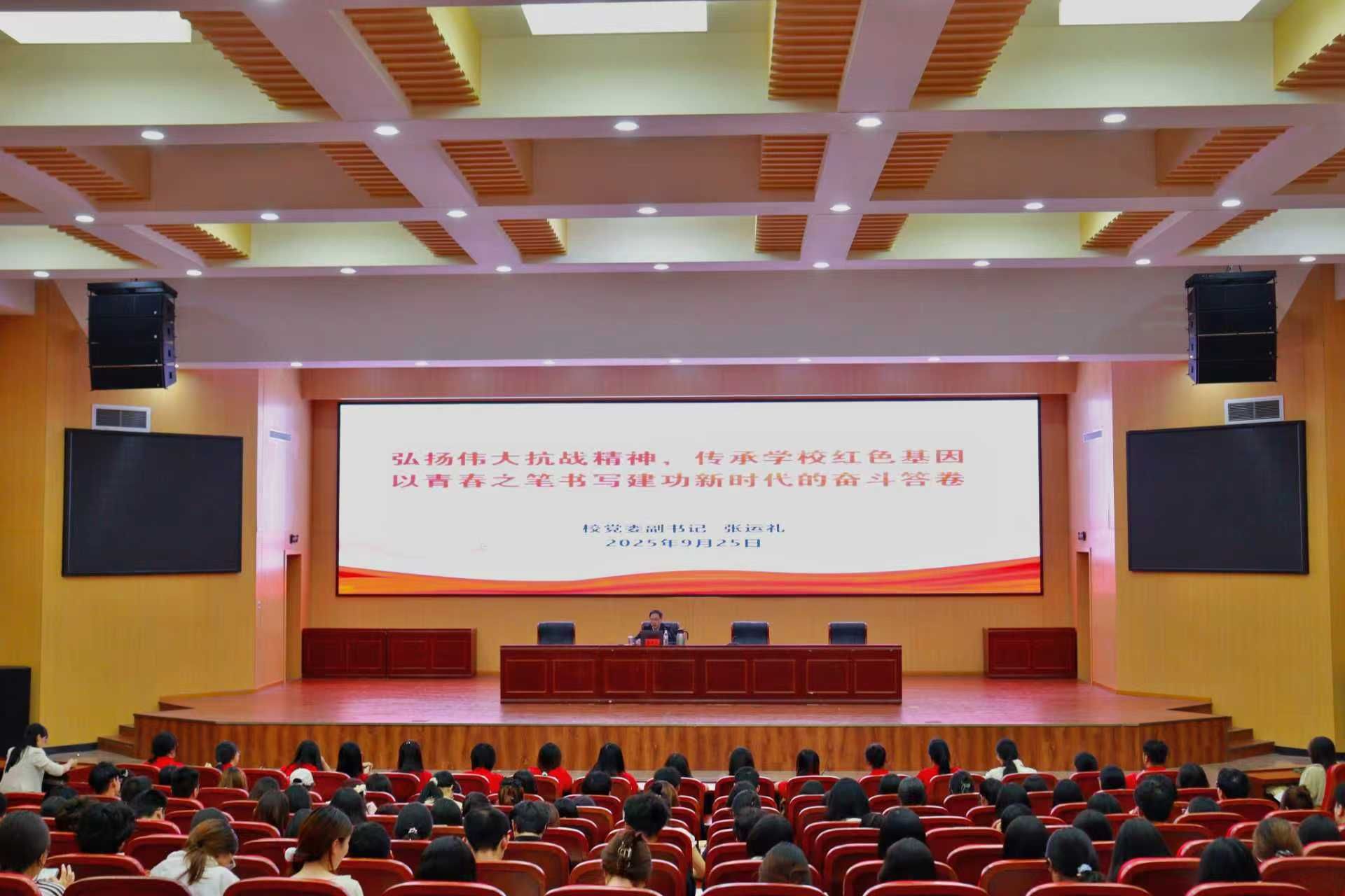 9月25日晚,校党委副书记张运礼在逸夫楼G1-112报告厅,为2025年团干部暨大学生骨干培训班学员做题为《弘扬伟大抗战精神,传承学校红色基因 以青春之笔书写建功立业新时代的奋斗答卷》的专题报告并讲授新学期“开学第一课”。