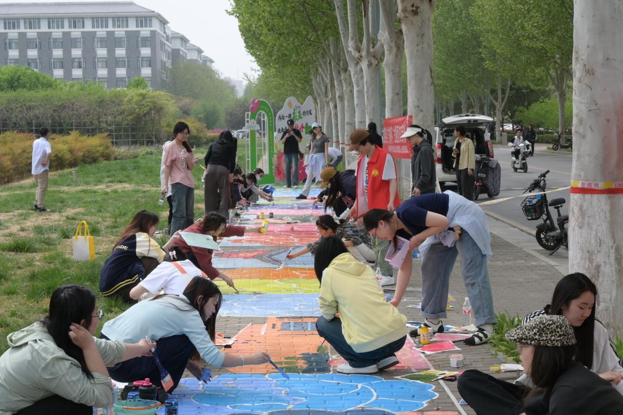 创作过程中,浓郁的艺术氛围和视觉效果吸引许多路过同学,一些非绘画专业的团员青年也主动加入队伍。大家分工明确、相互协作,历经2天的不懈努力,终于完成这条长35米的牡丹花路。