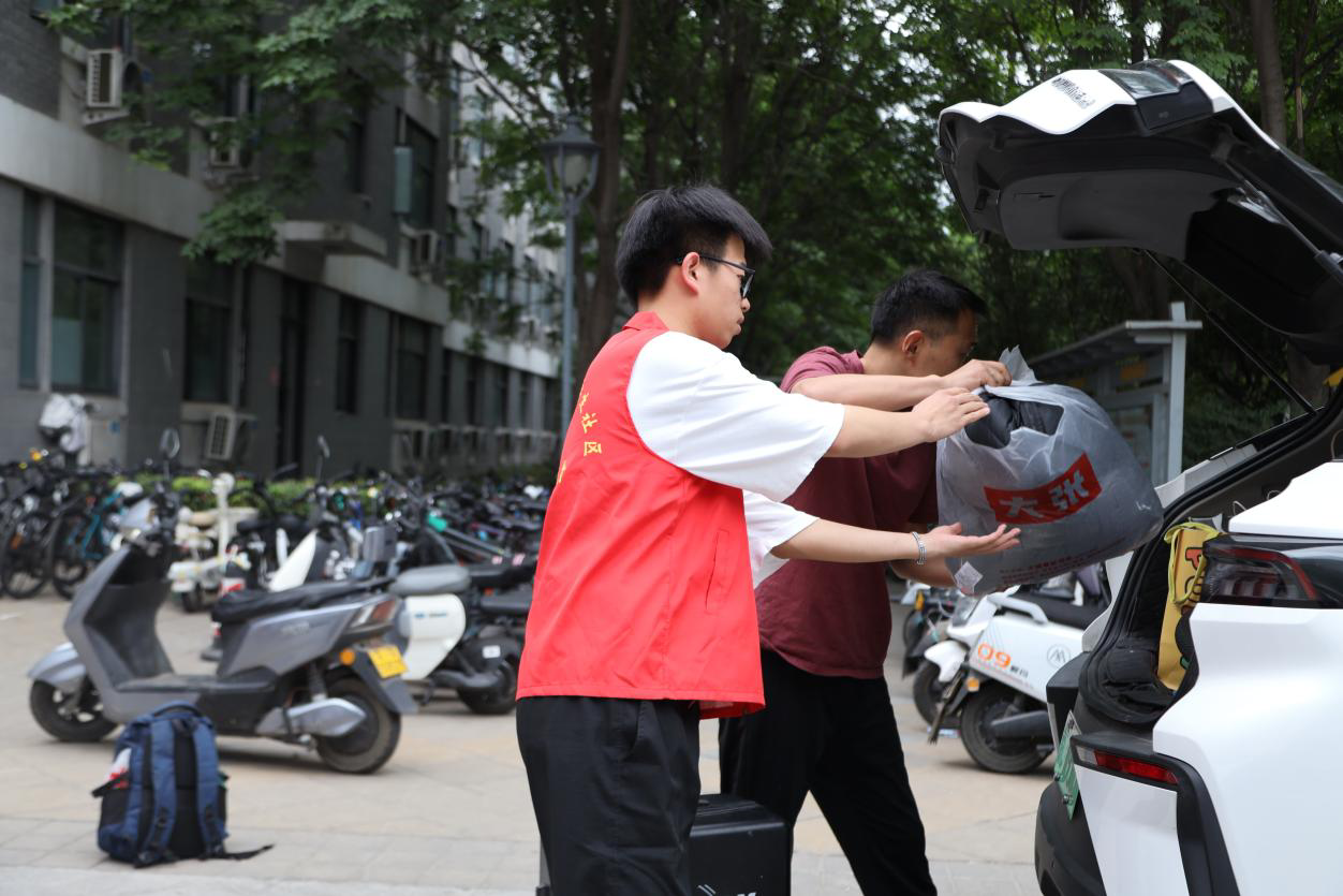 每天早上七点,志愿者们身穿红马甲早早起床,配合生活导师进行书院楼前的车辆梳理,确保毕业生们能够顺利的搬运行李。随着陆续有毕业生离开宿舍,志愿者们又开始奔波于楼上楼下,帮忙清理、打包、搬运行李,一个个庞大的包裹、一摞摞沉重的书籍,都在他们的努力下顺利到达邮寄点或者私家车后备箱。