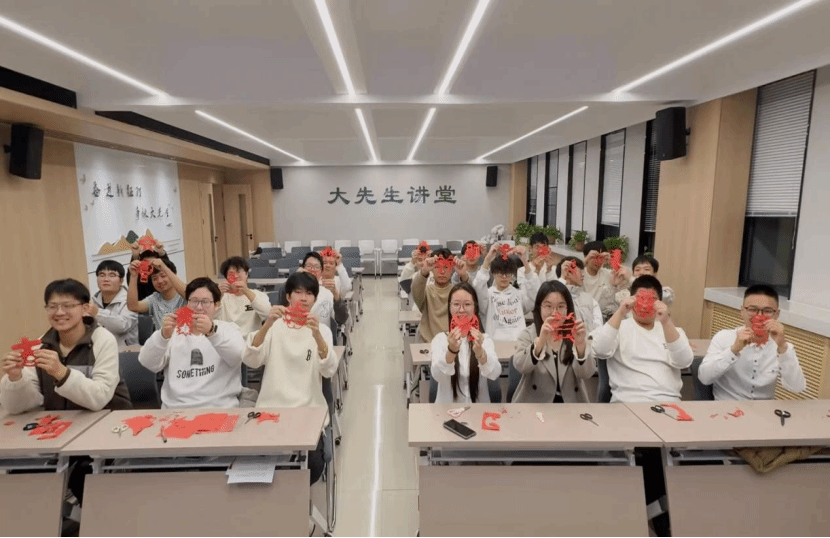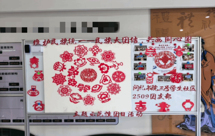 活动在庄严的国歌声中拉开序幕。全体成员首先观看了习近平总书记在全国民族团结进步表彰大会上的重要讲话视频,深刻领会新时代民族工作的核心要义。随后,2509团支部书记张元硕围绕“铸牢中华民族共同体意识”进行系统讲解,结合PPT生动阐释了民族团结对国家发展与社会和谐的重大意义;校青年讲师团徐思祺以《籽籽同心 开出团结花》为题发表演讲,深情讲述各民族像石榴籽一样紧紧相依的感人故事,引发在场同学的深切共鸣。在“同心圆·民族团花”剪纸环节中,同学们亲手剪制象征团结的图案,并将作品拼贴成大型“同心圆”,生动展现各民族同心同德、携手前行的美好愿景。最后,全体成员齐声高唱《爱我中华》,激昂旋律回荡全场,爱国情怀与民族自豪感在歌声中激荡升腾。