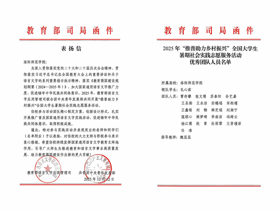 近日,教育部语言文字应用管理司、共青团中央青年发展部共同向学校发来表扬信,对我校新闻与传播学院“益”起推普爱心实践队在2025年“推普助力乡村振兴”全国大学生暑期社会实践志愿服务活动中的表现予以表扬。“益”起推普爱心实践队获评2025年全国优秀团队。