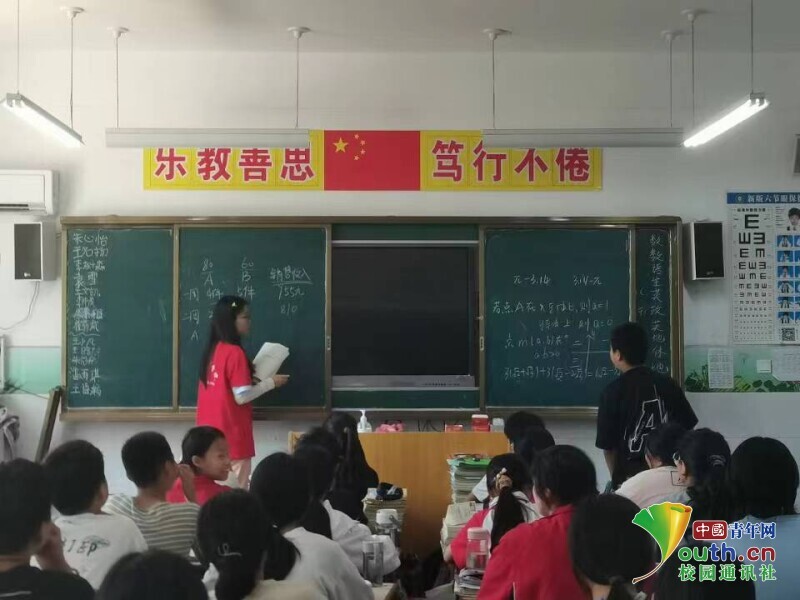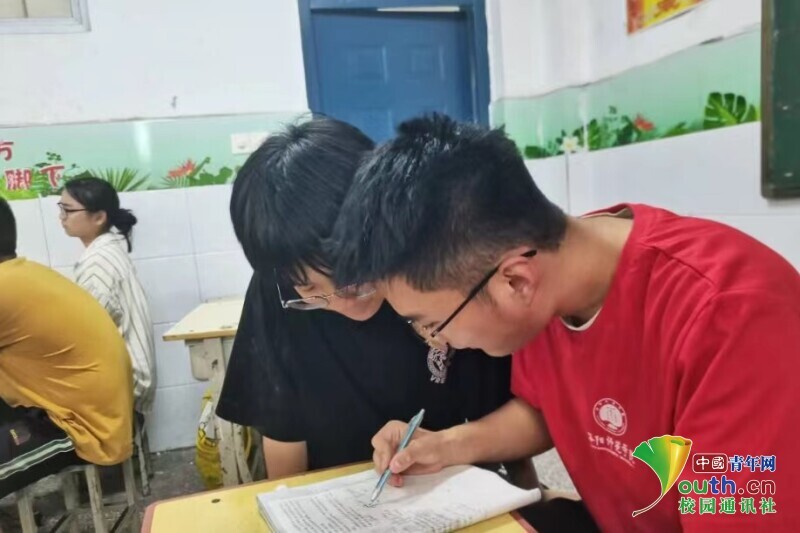 图片发自中青校园App图为实践队员正在讲解典型例题,一名同学提出疑问,实践队员细心为他解答的画面。中国青年网通讯员 崔婧 摄