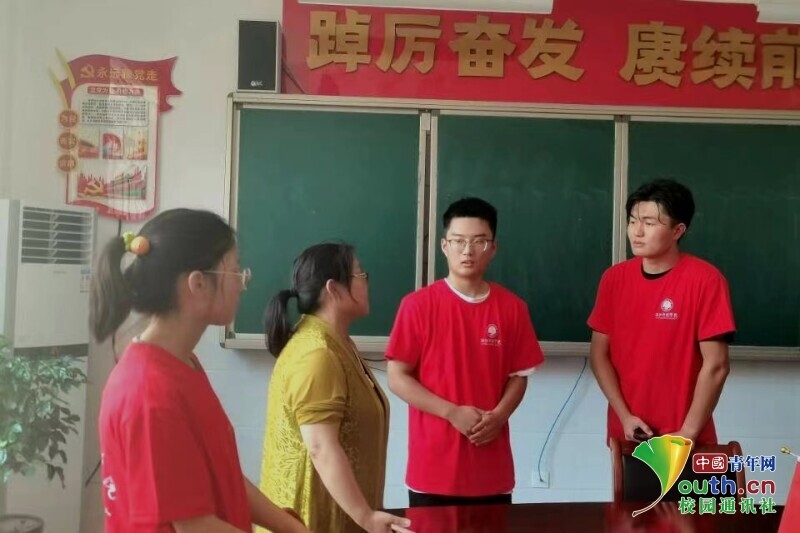 图片发自中青校园App图为实践队员初到学校,与学校老师针对课程的进度、学生程度等内容进行交流的画面。中国青年网通讯员 崔婧 摄