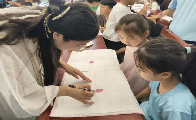 “水墨牡丹”国画创作之旅开启。队员们现场示范,详细讲解牡丹红、曙红等绘画所需颜色的调色技巧与笔法运用。小朋友们认真学习,从拘谨到大胆挥毫,用画笔勾勒心中的牡丹盛景。国画课后,书法课堂接力。实践队成员手把手教学,从笔画书写到字体结构,引导孩子们感受汉字魅力。