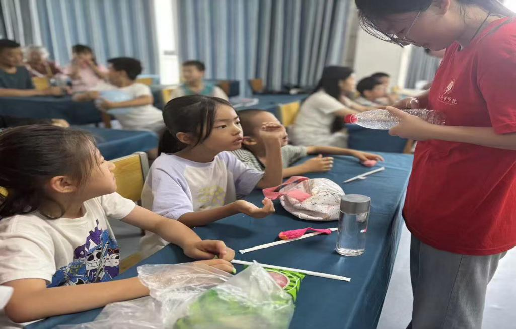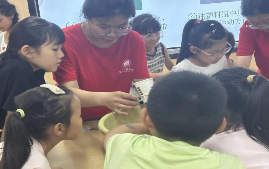 7月1日,立雪书院学生社区“启梦童心,科普同行”暑假三下乡社会实践队,在栾川县红庙村、张盘村小学开展暑期科普活动,实践团队以反冲水陀螺、压力瓶发声、纸火箭制作三大实验为载体,为孩子们打造沉浸式科学课堂,点燃他们对物理世界的探索热情。在压力瓶发声的实验中,实践队员先演示大气压如何使气球膜震动发出声响,让孩子们亲眼见证“看不见的力量”;将水流从纸杯小孔高速喷出,纸杯瞬间飞速旋转,形成旋转的“水陀螺”,引得孩子们惊叹连连;纸火箭制作与发射将活动推向高潮,孩子们亲手折叠火箭,在开阔场地发射,随着“嗖”的一声,纸火箭腾空而起,实践队员顺势讲解反冲运动、空气阻力和能量转化知识,让孩子们在欢呼中理解物理原理。实验结束后,孩子们纷纷举手提问,从“火箭为什么能飞那么高”到“如何让陀螺转得更久”,求知的火花在互动中不断迸发,从被动接受转变为主动探索。这场充满趣味与知识的物理之旅,不仅激发了孩子们对科学的热爱,更在他们心中播下了探索的种子。