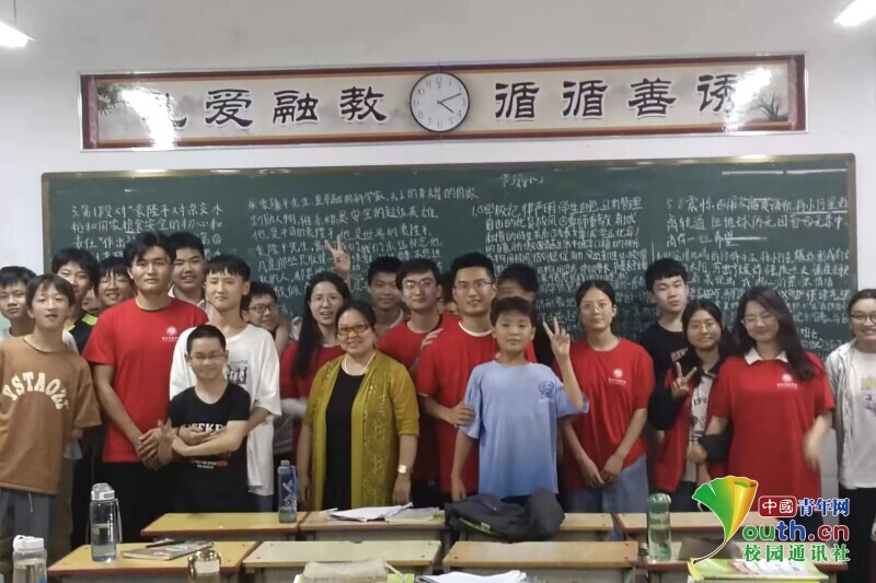 图片发自中青校园App图为辅导结束之后,实践队员与老师学生在讲台一起合影留念的画面。中国青年网通讯员 崔婧 摄