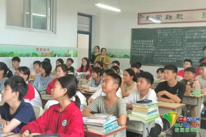 图片发自中青校园App图为学生认真听实践队员讲课,学校老师在教室后面进行指导和维持纪律的画面。中国青年网通讯员 崔婧 摄