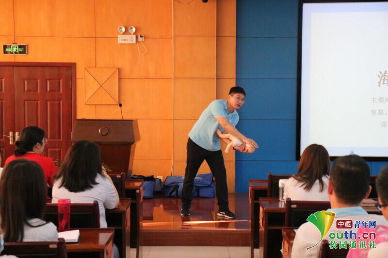 图为指导老师刘曙光向企业员工讲解并演示对于婴幼儿海姆立克急救法的操作要领。中国青年网通讯员 赵如雪 供图