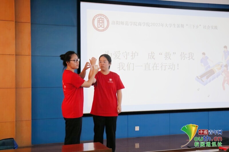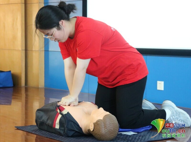 图为实践队员演示在使用“心肺复苏术”过程中胸外按压的操作技巧。中国青年网通讯员 赵如雪 供图