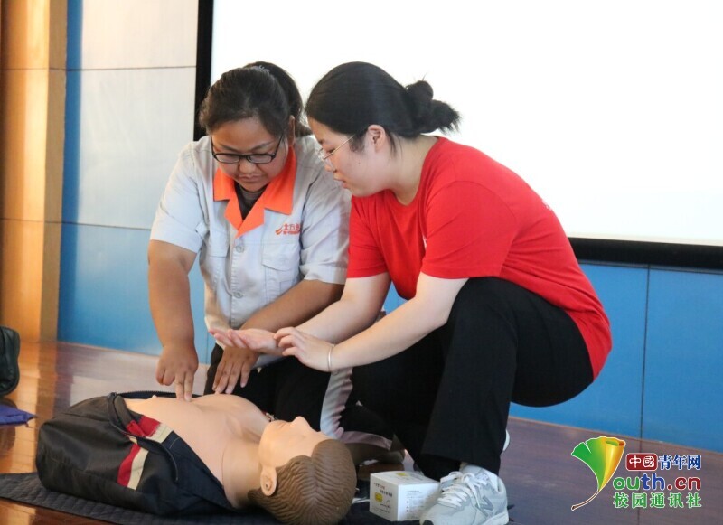 图为企业员工实践操作“心肺复苏术”急救手法的练习,实践队员给予指导与纠正。中国青年网通讯员 赵如雪 供图