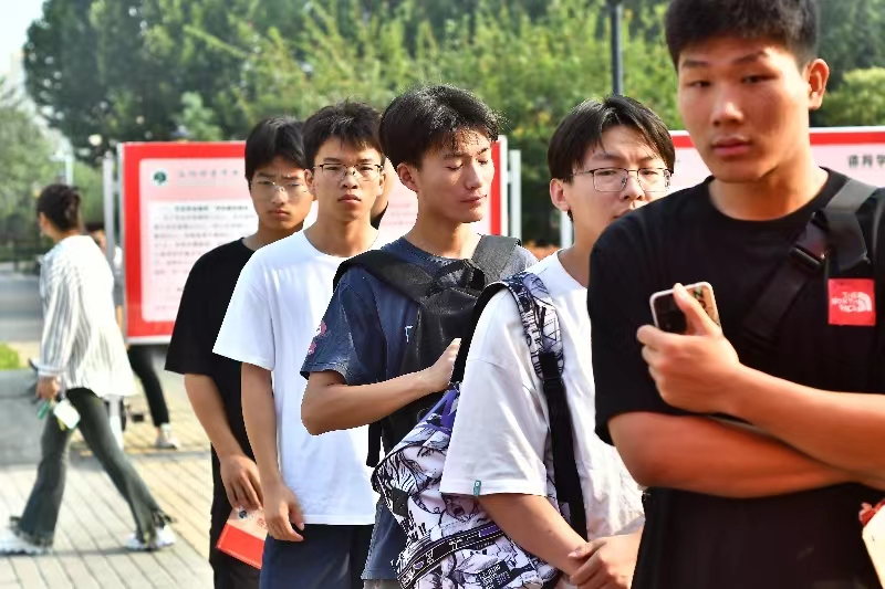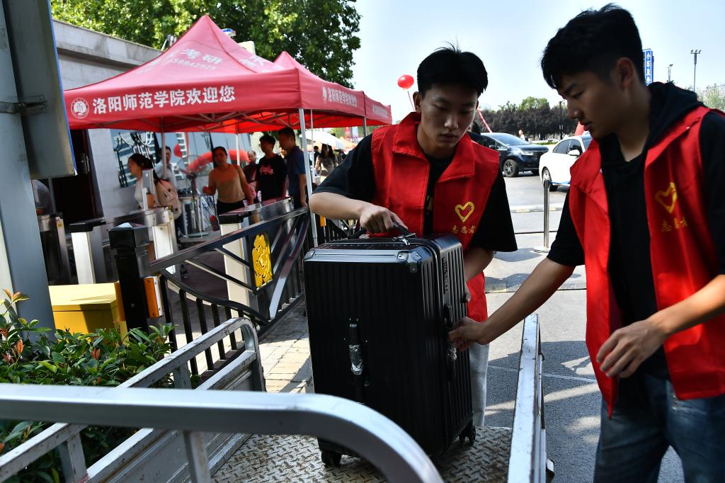 志愿者学长学姐主动帮着拎行李,一路谈笑风生。新生细声地叫着“学长学姐”,老生们也开心地介绍这介绍那。人头攒动,秩序井然。