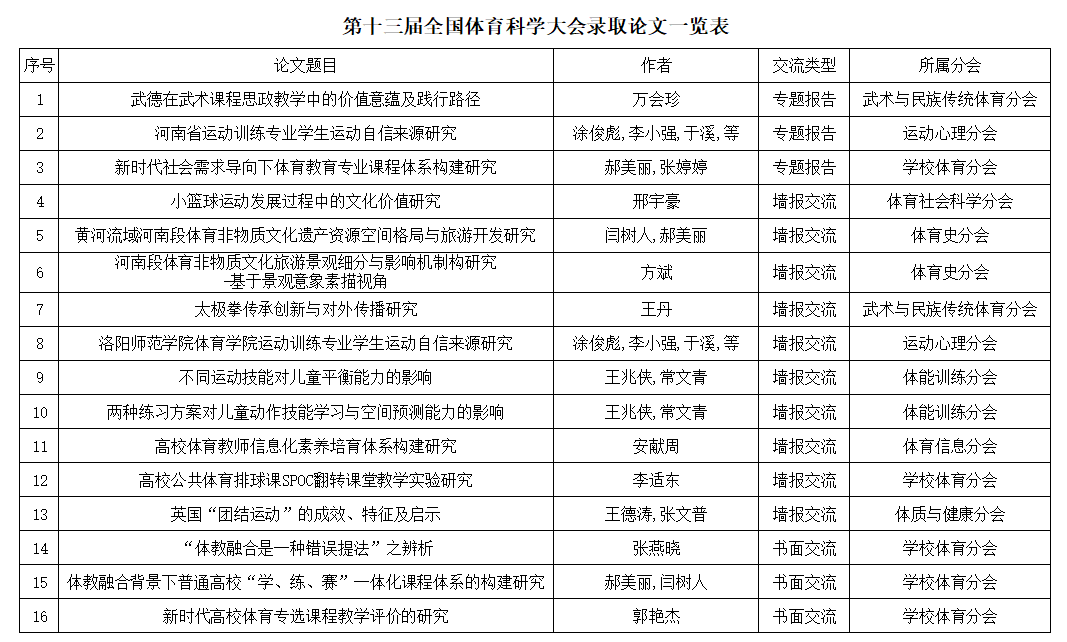 本次大会我院共录用专题报告3篇,墙报交流10篇,书面交流3篇,创下体育学院参加全国体育科学大会论文之最。专题报告和墙报现场,我院教师精心准备、团结协作,无论是报告,还是墙报,均引起与会人员的高度关注,展现了洛阳师范学院体育学院教师风采。同时参会教师主动与来自全国各地的专家学者进行广泛的学术交流,共同探讨体育发展与强国建设。