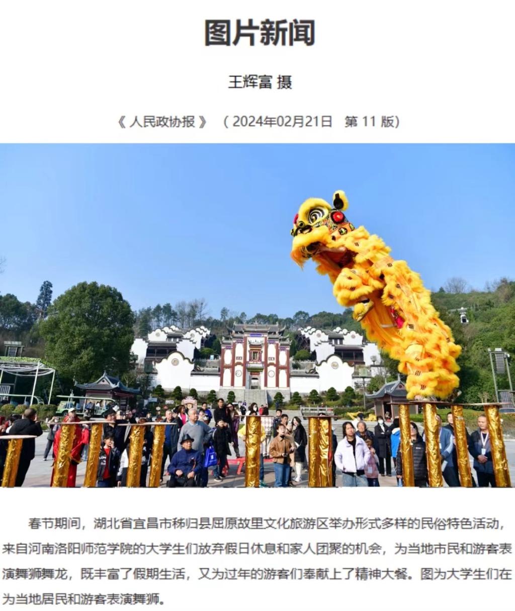 现场氛围活跃,当天有许多同学合照留念,这一次演出即展现出了我们当代大学生的青春活力,又弘扬了优秀传统民族文化,让更多人了解到舞龙舞狮这项运动,后续我们通过发布训练小视频的方式,在网络上也等到了许多好评与认可,湖北当地文旅局也通过观看视频,找到了我们团队,今年春节,我们舞龙舞狮团队参加了湖北宜昌市的各类大型娱乐活动,并被当地记者采访,新闻也发到了人民政协报。