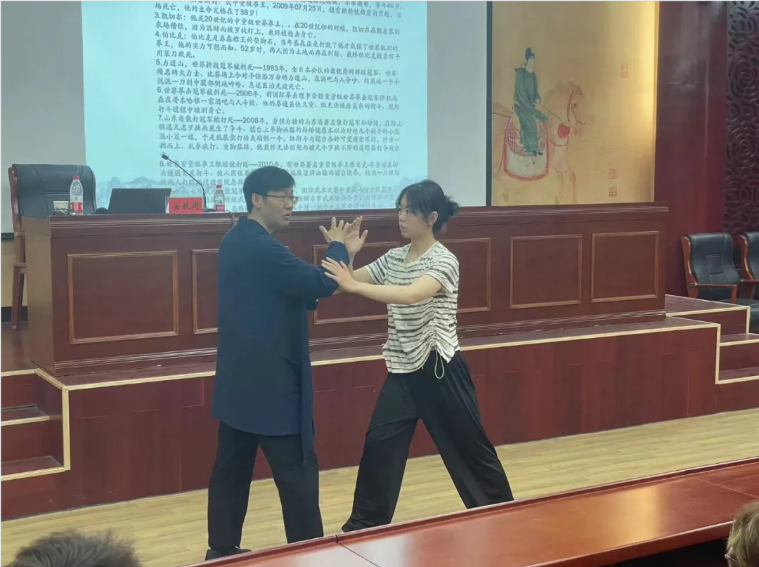 安献周结合河洛地区的地理位置,从太极拳的起源与发展、拳法体系和太极拳的演变三个方面,为同学们详细阐述了河洛地区太极拳的体育化演变之路和魅力。他通过讲述太极拳的发展变化历史和现场表演太极拳拳法,加深同学们对太极拳这一传统阴阳哲学理论的认识。他希望同学们能够将这内涵丰富的“哲拳”发扬光大,传播和发展优秀的河洛武术文化。