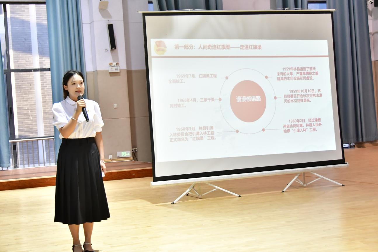 一渠绕青山,精神动天下。红旗渠是上世纪林县人民在太行山上建成的大型灌溉工程,结束了林县长期干旱缺水的历史。其孕育出的“自力更生,艰苦创业,团结协作,无私奉献”的红旗渠精神影响了一代又一代青年。9月20号,鸿都书院一号学生社区在体育馆演播厅为2024级全体新生开展以“红旗渠精神”为主题的讲座,青年讲师团冯凯雯担任主讲人。书院全体辅导员、2024级新生共500余人参加。