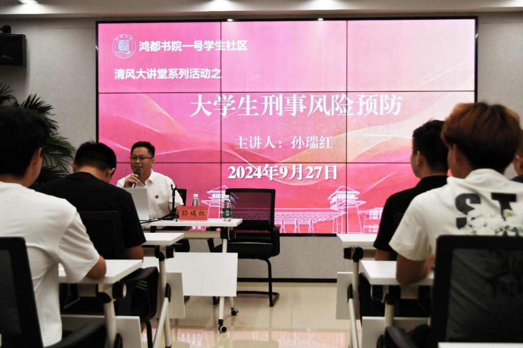为进一步强化大学生法治意识,教育引导大学生增强敬畏意识、底线意识,严守纪法红线,争做社会主义核心价值观的积极践行者。2024年9月27日晚,鸿都书院一号学生社区特邀请河南森合律师事务所主任孙瑞红作“大学生刑事风险预防”专题辅导报告。书院社区育人导师代表、学生干部代表及2024级新生代表近百人参加。会议书院社区党委副书记李海瑞主持。