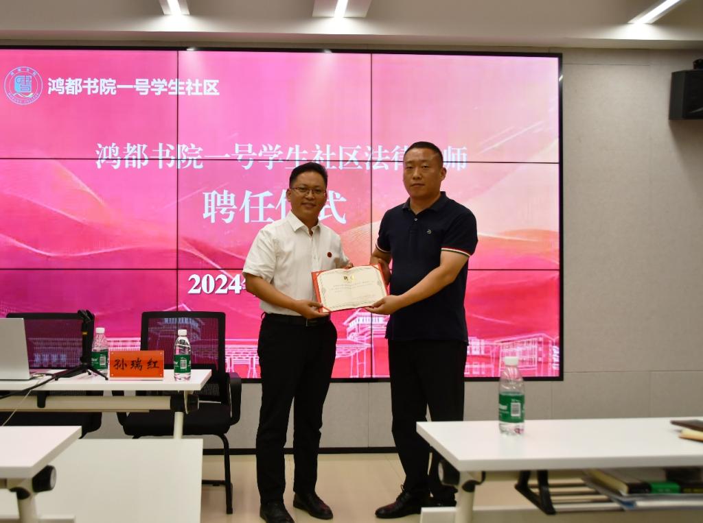 会议最后,鸿都书院一号学生社区党委副书记李海瑞为孙瑞红同志颁发法律导师聘书。
