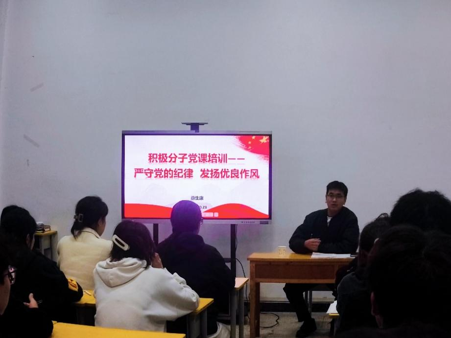 10月23日晚,积极分子党课培养班在体育学院b111办公室开讲,我们有幸邀请到鸿都书院一号院育人导师薛生康老师为我们进行党课讲解,薛生康老师以“严守党的纪律,发扬优良作风”为主题,从党的六大纪律,对党员的纪律处分以出发点进行讲解,进一步加强了同学们对党的认知。