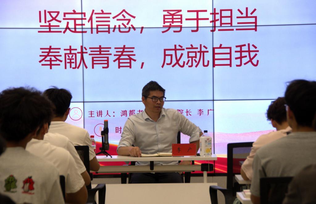 李广院长围绕“入党为什么”这一根本命题展开系统阐述,强调要立足马克思主义理论根基,厚植“我将无我,不负人民”的宗旨意识,把个人理想融入中国特色社会主义伟大实践。通过剖析新时代共产党员“有担当不邀功,有困难必担当”的特质,深入诠释“奉献是共产党员最鲜明的精神标识”这一核心要义,要求同学们以“功成不必在我,功成必定有我”的胸襟投身伟大事业。