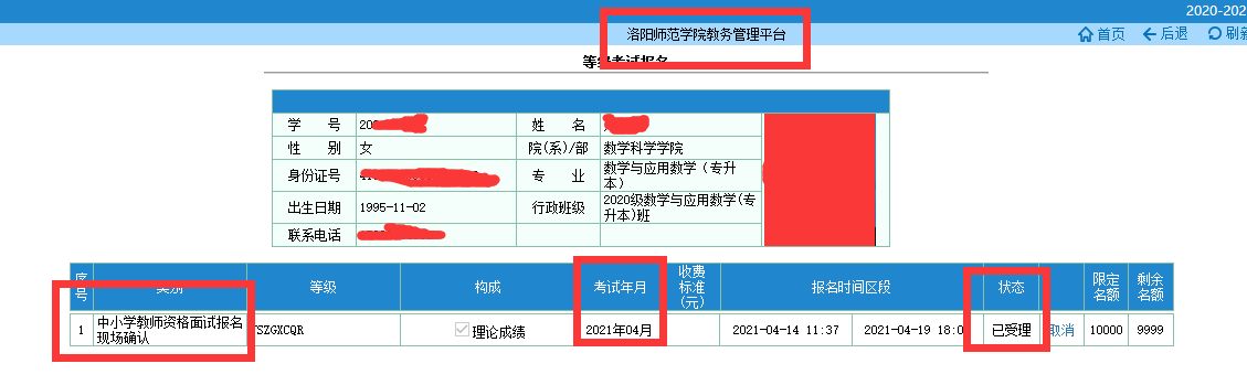 报名方式:学生登录教务系统WEB端—学生成绩—等级考试报名—选择中小学教师资格面试现场确认,进行报名(报名成功后务必保留报名成功页面截图,见下,截图界面须清楚显示红色区域和标涂部分)。