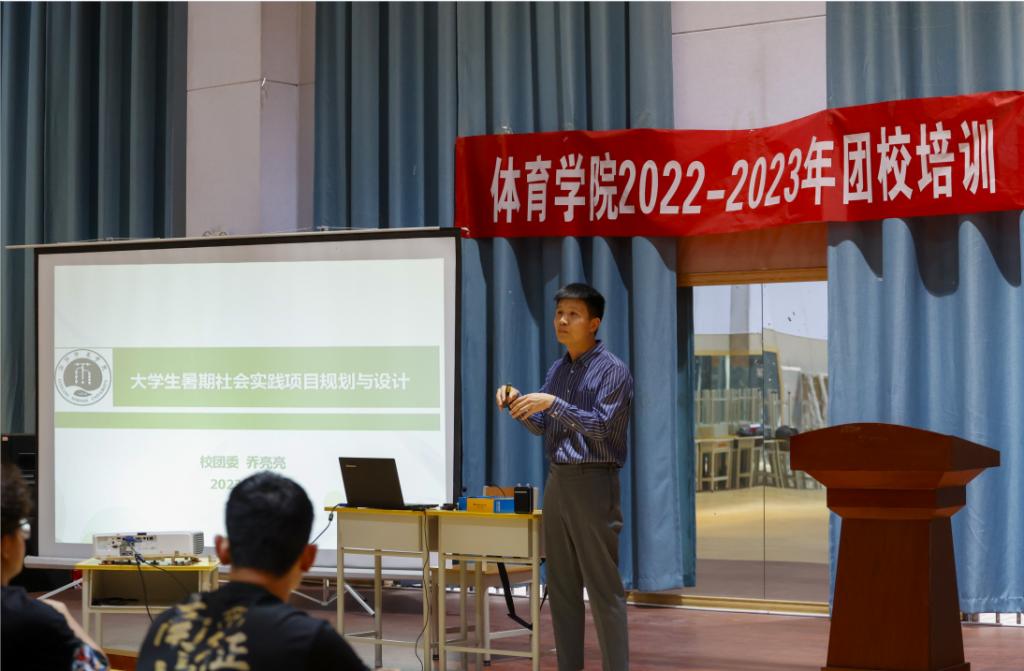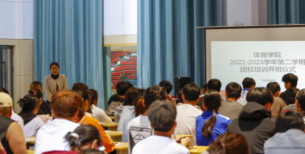 为深入贯彻学习党的二十大精神,进一步加大对广大青年政治素养的教育力度,提高我院团学干部的自身能力素质,4月13日下午,体育学院于体育馆演播厅举行2022-2023学年第二学期团校培训开班仪式,并邀请校团委创新实践部副部长乔亮亮开展了第一次课程。我院团委书记胡唯唯、团委副书记王婷、学生会主席团成员杨丰硕、禹露和100余名学生干部参加了此次培训。