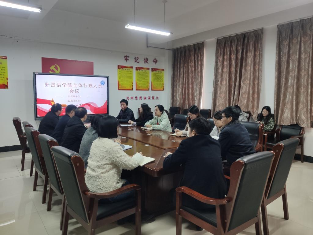 为理清新学期工作思路,保证新学期各项工作有序、高效开展,2月20日,我院在外语楼504会议室召开了2022-2023学年第二学期第一次全体行政人员会议。学院党政领导及全体行政人员参加了此次会议。会议由学院党委书记李广主持。