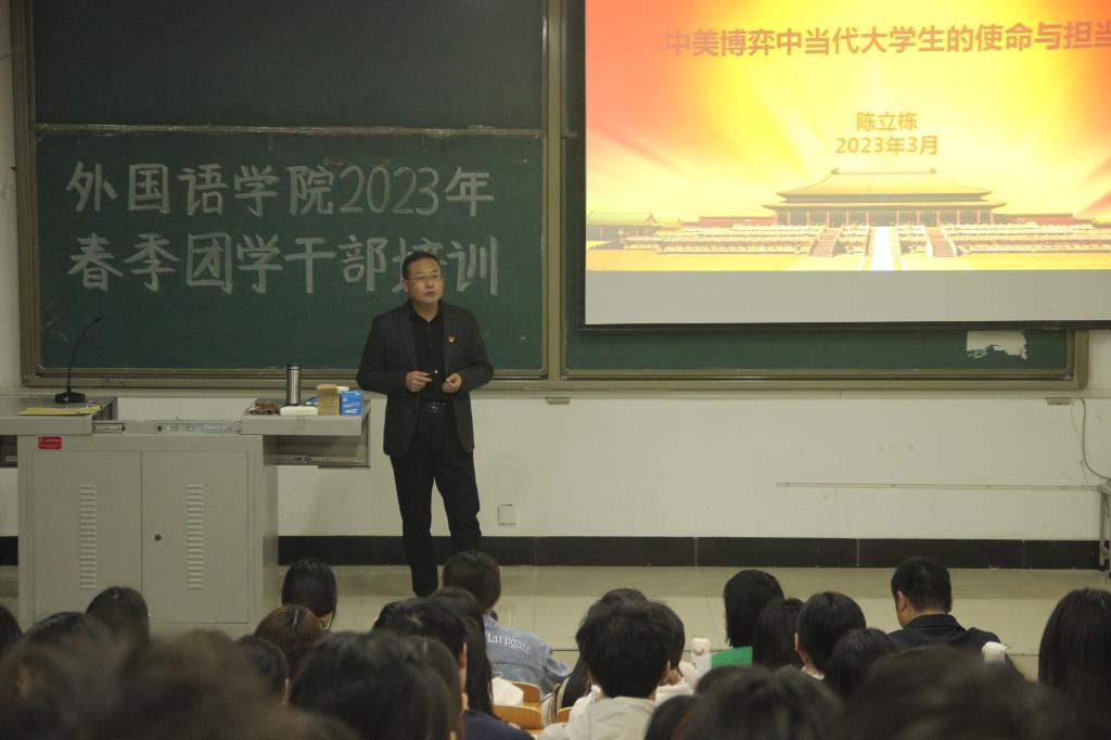 为深入学习宣传和贯彻落实党的二十大精神,加强团学干部队伍建设,提高学生干部的综合素质和能力,3月24日,我院特邀商学院党委书记陈立栋在外语楼101教室进行“中美博弈中的当代大学生使命和担当”的专题讲座。我院党委副书记陈朝魁、团委书记赵娟娟及全体团学干部出席此次讲座。