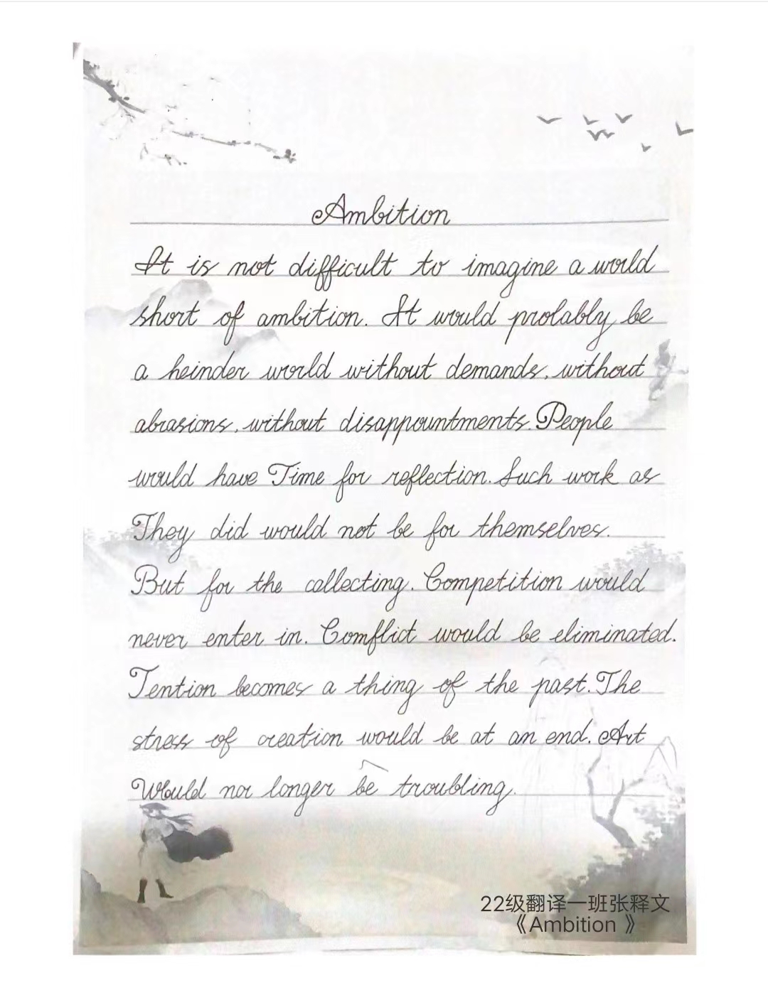 本次比赛分为钢笔字、粉笔字、毛笔字三个部分,书写的语种为中英文。活动期间,同学们以极大的热情和认真的态度参与了这次活动。评委老师按照书写、结构、字形、效果四方面的标准共评出13件优秀作品。其中班闫云帆的《奋斗铸就美好生活》、葛思奇的《我的二十岁遇上党的二十大》、唐焕焕的《青春献礼二十大》、张释文的《Ambition》、鹿旭升的《youth》、李荣的《念奴娇·赤壁怀古》夺得魁首;荣获二等奖的参赛作品有王超的《初心铸就伟业,使命引领征程》、王雪的《youth》和杨馨的《七律·长征》;获得三等奖的参赛作品有李佳鲤的《the power of life》以及张锐的《党的二十大报告》摘选、田文东的《春江花月夜》、周梦媛的《最美的情书》。参赛作品书写标准,字迹流畅端正,卷面整洁美观,令人赏心悦目。大家用笔墨歌颂党和祖国,以书法之美传递奋进力量。