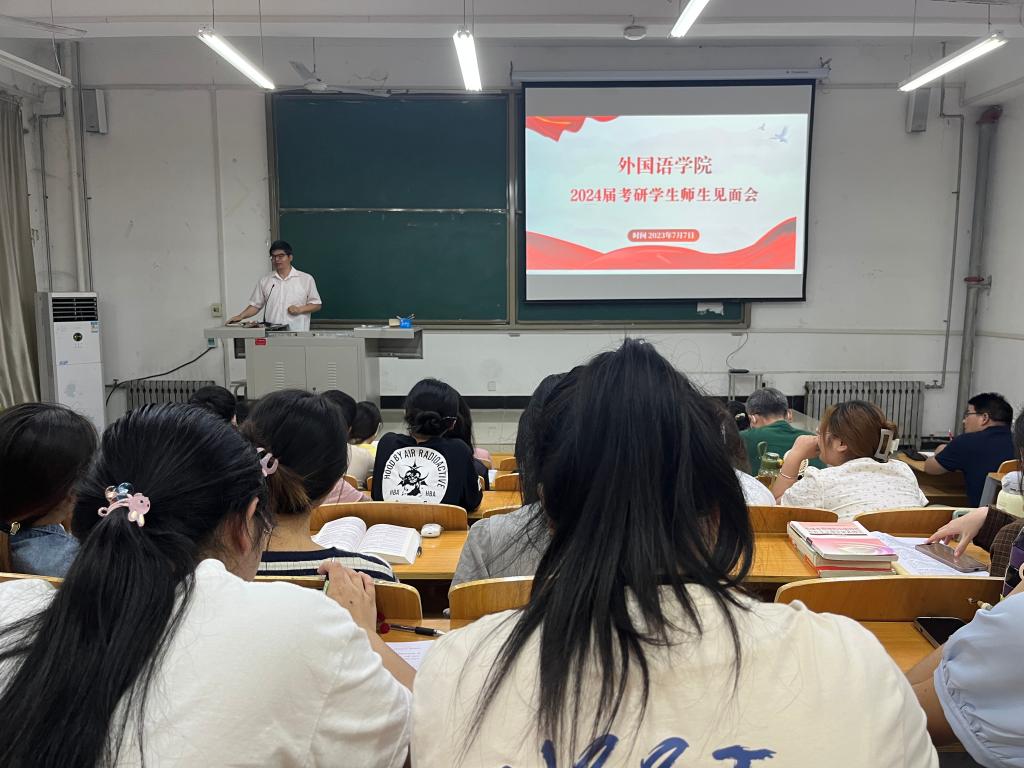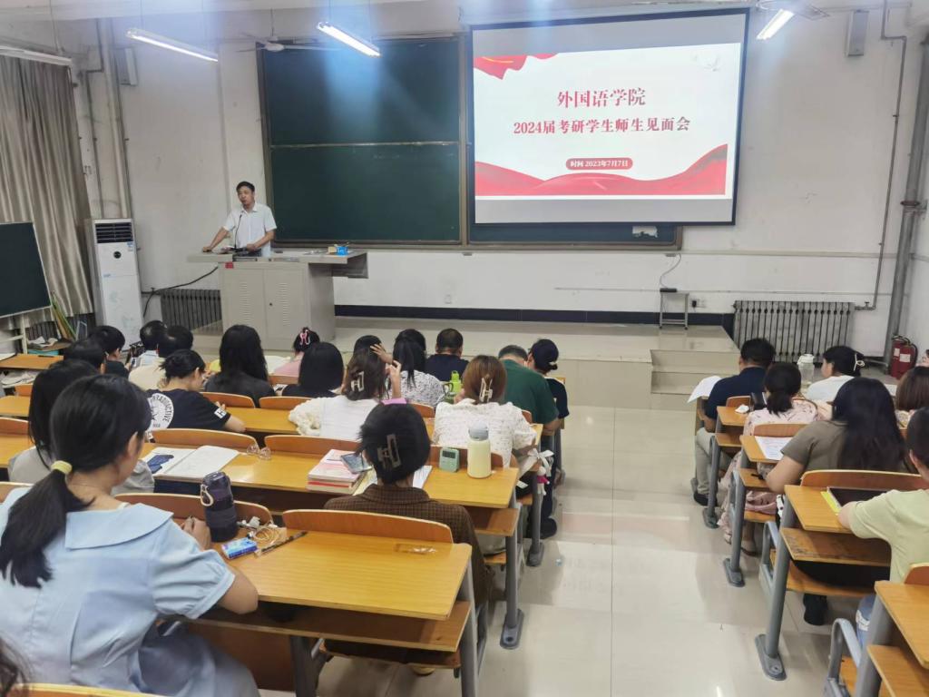 为助力学院2024届本科生全面做好考研备考工作,做到科学选择目标学校、精细做好复习计划、全面解决专业难点疑点、合理做到舒心高效学习,从而不断增强同学们考研信心,7月7日上午,我院在外语楼101教室召开2024届考研学生师生见面会。学院党委书记李广、副院长刘启成、副书记陈朝魁,全体考研指导教师、毕业班辅导员老师和2020级全体同学参加了大会。大会由陈朝魁主持。