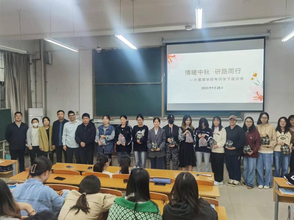 喜迎中秋国庆双节,心系考研学子。9月28日下午,学院党政领导们、考研指导教师以及毕业班辅导员老师来到外语楼101教室慰问2020级考研学子,为大家送去节日祝福和考研关怀。