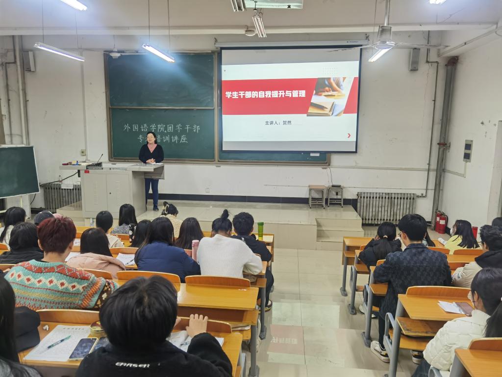 为进一步发挥学生干部队伍的示范引领作用,增强学生干部的服务意识和责任感,我院于11月23日在外语楼101教室举办以“ 学生干部的自我提升与管理”为主题的专题讲座。此次讲座由学院党委副书记贺然主讲,全体团学干部均参加了此次活动。