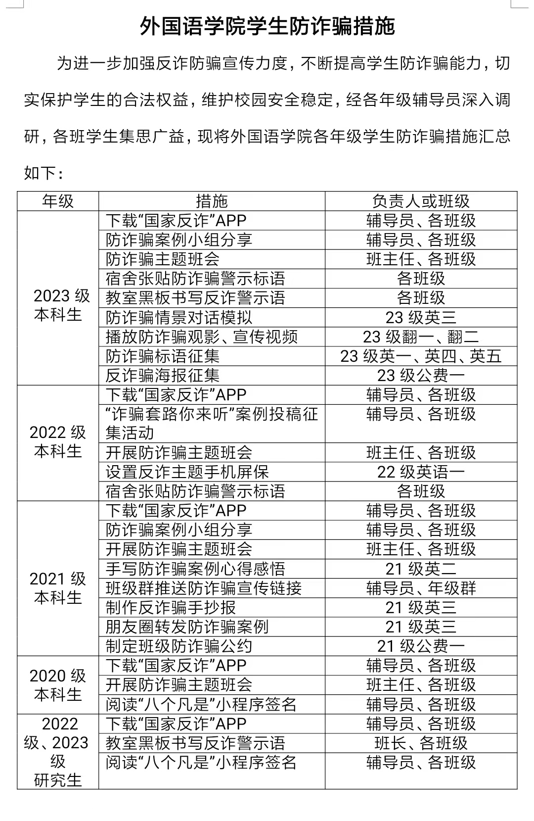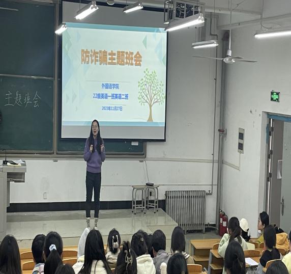 外国语学院一直以来把预防电信诈骗工作作为全院的重点工作,始终按照学校反诈工作的要求和部署,不断丰富反诈形式,扎实开展学院的防电信诈骗工作,确保工作取得实效,助力平安校园建设!
