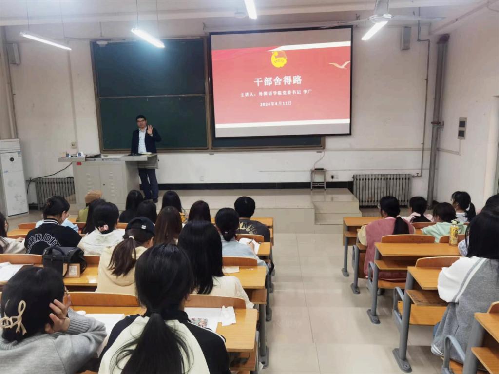 为加强团学干部队伍建设,提高学生干部的综合素质,我院于4月11日下午15时30分在学院101教室做“学生干部舍得路”专题讲座。此次讲座由学院党委书记李广主讲,全体学生干部参加此次培训。