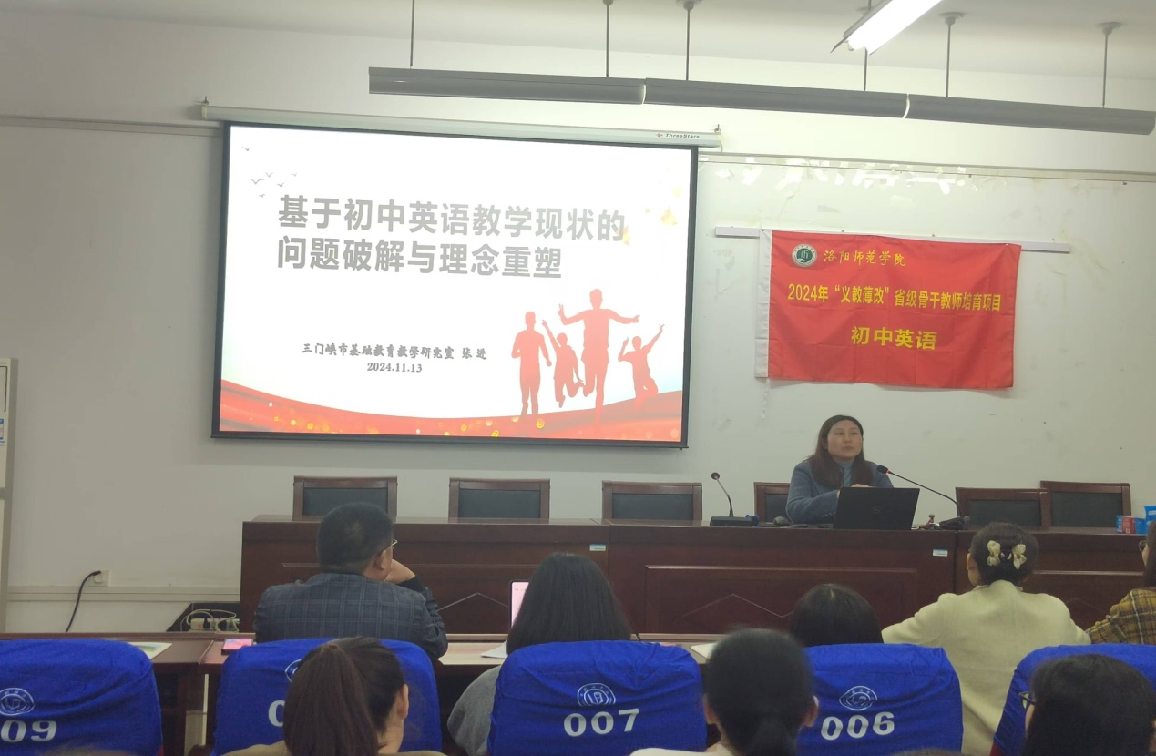 2024年11月13日,三门峡市基础教育教学研究室的张进老师为骨干教师学员做了题为《基于初中英语教学现状的问题破解与理念重塑》的专题讲座。张老师以研读新课标,重塑教育理念为开端,分析了英语课堂教学现状,指出老师们应细致研读新课标,以新课标为理论依据,进而确立教学单元、教学课时的学习目标。