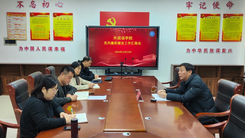 为深入推进党风廉政建设工作,认真落实关于全面从严治党的各项决策部署,12月13日,外国语学院党委在A1-504室召开学院2024年度党风廉政建设工作汇报会,校党委副书记、工会主席赵海彦出席会议,学院党政班子成员参加,学院党委书记陈朝魁主持会议。