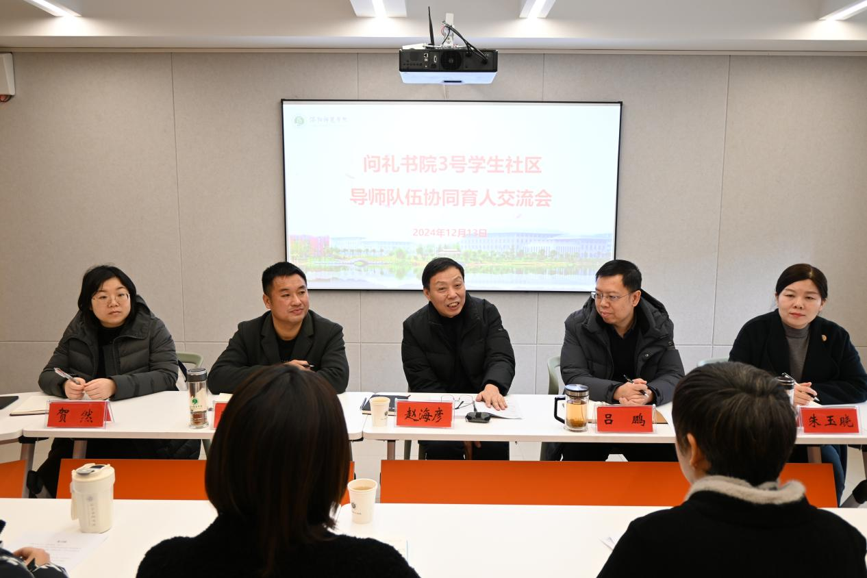 12月13日上午,问礼书院3号学生社区在二楼多功能厅召开导师队伍协同育人工作交流会。校党委副书记、工会主席赵海彦出席,书院社区班子成员及五大导师代表参加,会议由书院社区党委书记吕鹏主持。