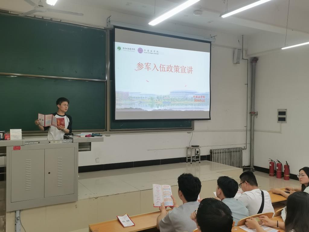 为深入贯彻习近平强军思想,积极响应国家号召,激励引导我院大学生应征入伍,6月19日,问礼书院三号院联合外国语学院在A1-101开展大学生征兵入伍政策宣讲会,学院征兵工作负责人李睿通及全体应届毕业生参加。